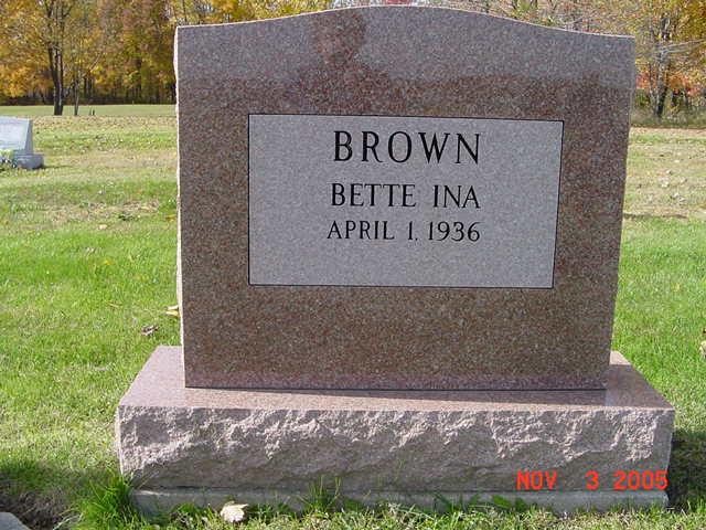 I am Bette Ina Brown, daughter of Paul E. Brown and Pauline Kinsey Brown, born April 1, 1936 in Molly Stark, the TB hospital in Stark County, Ohio. My tombstone is already set on Section D, Quadrant II, Lot 136 in the Augusta Cemetery.